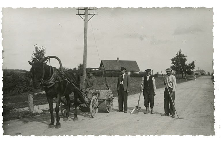 Veega täidetav malmist teerull Mazsalaca– Eesti piir teel, 1934. a. Foto Läti Teedemuuseumist.