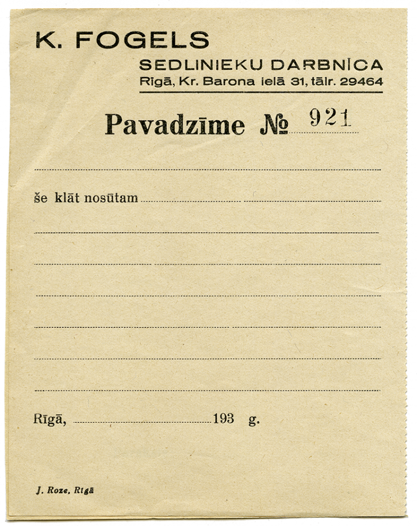 K. Fogeļs’i sadulsepa töökoja saateleht. 20. saj 30. aastad. Dokument Läti Teedemuuseumist.