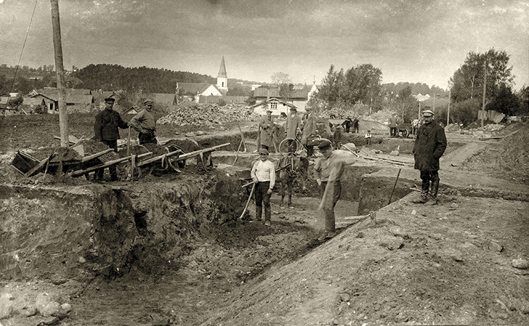 Tee Smiltene–Rauna ehitamine Daktera tänava juures Smiltenes, 1927. Foto Läti Teedemuuseumi arhiivist.