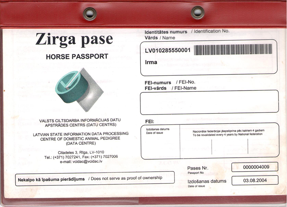 1947 m. biirželio 4 SSRS Valstybinio plano Centrinė statistikos valdyba išleido potvarkį Nr. 766, jog arkliams reikalingi pasai. Nuo2004 m. arkliams Latvijojepasai yra būtini, nepriklausomai nuo arklio veislės ar kilmės. Arklys visą savo gyvenimą turi tik vieną pasą. Pasas padaromas, kumeliukui sulaukus pusės metų. Arklio pase yra nurodomas arklio savininkas, arklio identifikacinis numeris, vardas, gimimo data, gimimo vieta, buvimo vieta, kilmės duomenys (jei tokie žinomi), veislė, lytis, plauko spalva ir išorinių žymių aprašas. Šiais laikais kiekienas arklys yra čipuojamas. Informacija pase ir čipe privalo būti identiška.