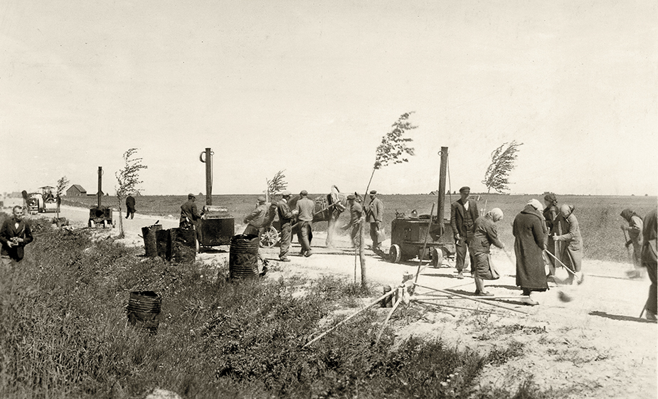 Rygos–Iecavos–Bauskės plento asfaltavimas, 1939 metai. Nuotrauka iš Latvijos kelių muziejaus.