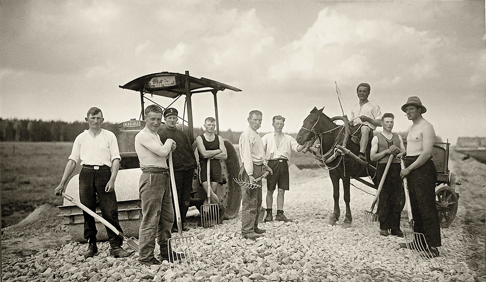 Kelio darbininkai Rygos–Bauskės plente prie Iecavas, 20 a. ktvirtojo dešimtmečio pabaiga. Nuotrauka iš Latvijos kelių muziejaus.