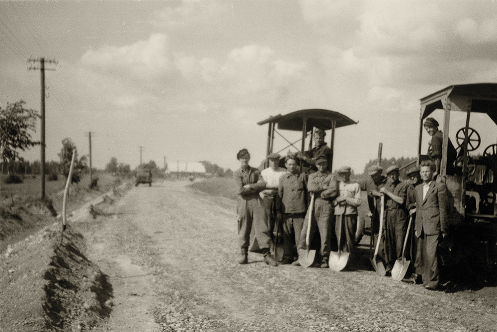 Kelio darbininkai remonto darbuose 1947 m. vasarą. Nuotrauka iš Latvijos kelių muziejaus archyvo.