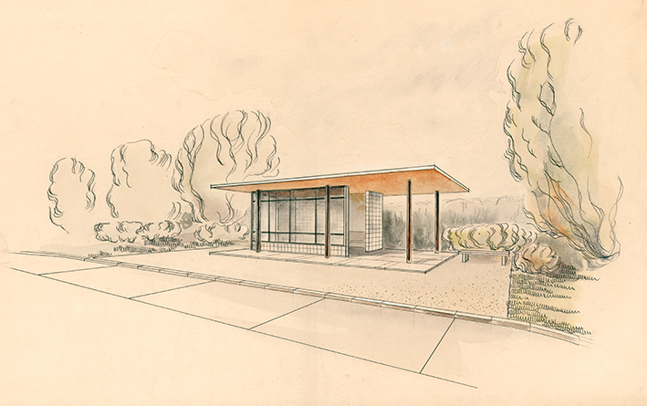 Keleivių paviljono eskizas, architektės Valdos Uozuolos darbinė medžiaga, aštuntojo dešimtmečio pabaiga. Iš Latvijos kelių muziejaus archyvo.