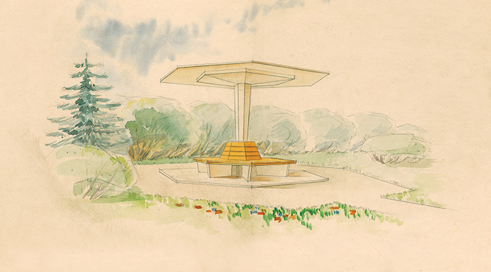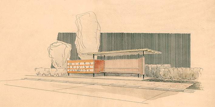 Veltos Reinfeldės eskizai autobusų stotelių apstatymui, 20 a. septintasis dešimtmetis