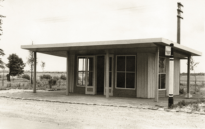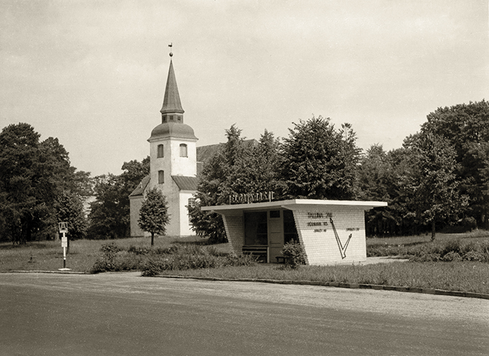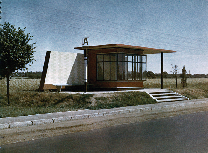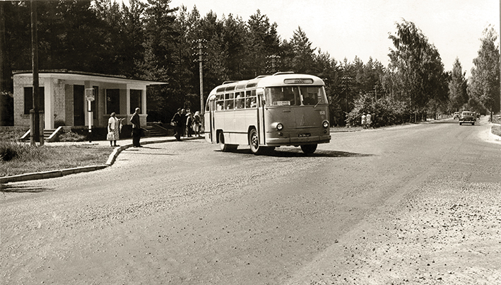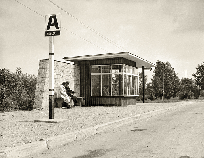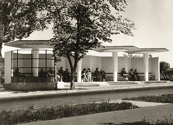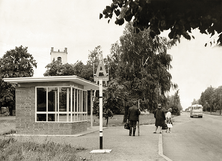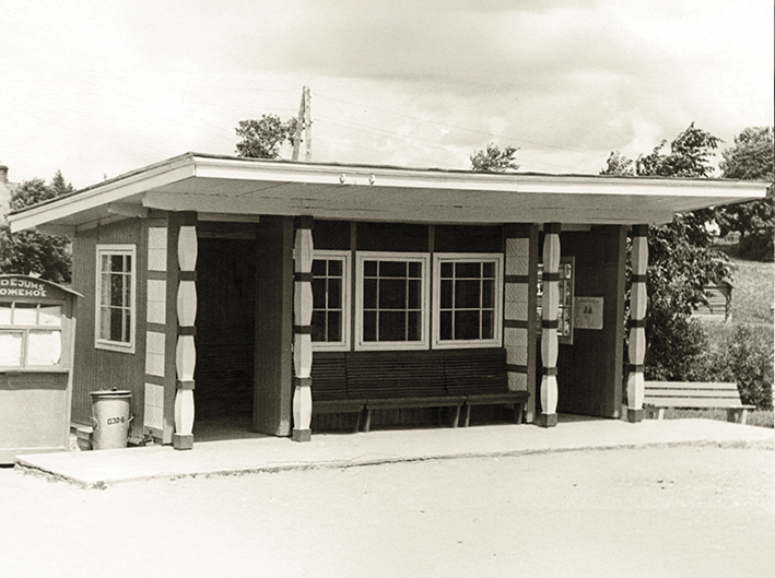 Autobusų stotelė su autopaviljonu, 20 a. šeštasis dešimtmetis. Nuotrauka iš Latvijos kelių muziejaus.