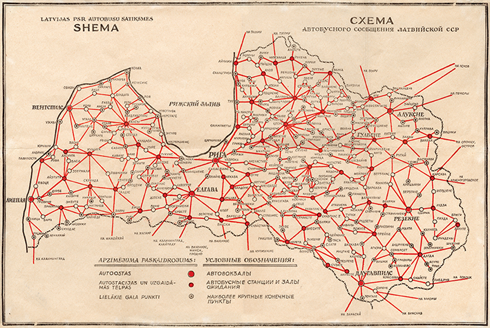 Latvijos TSR autobusų eismo linijų schema, 20 a. aštuntasis-devintasis dešimtmečiai. Žemėlapis iš Latvijos kelių muziejaus archyvo.