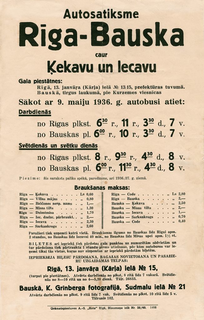 Autobusų eismo Ryga–Bauskė per Kekavą ir Iecavą grafikas nuo 1936 m. gegužės 9 iki 1936./37 m. žiemos. Išspausdintas viename lape spaustuvėje a.-S. Rota Rygoje, Blaumanio g. Nr. 38/40. Sąrašas iš Latvijos kelių muziejaus archyvo.