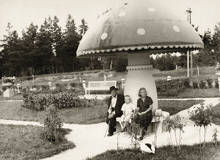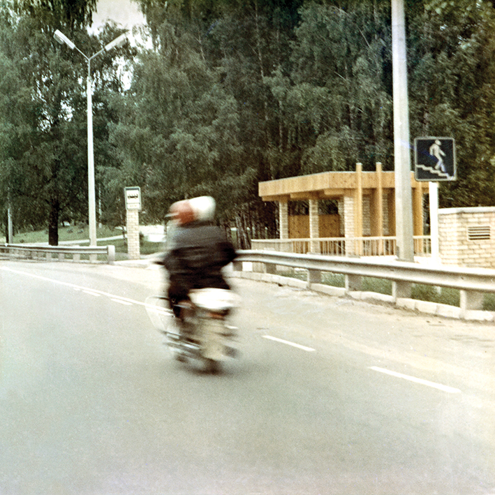 Poilsio aikštelė Sēnīte (‘grybukas’) prie Inčiukalnio autokelyje Ryga–Pskovas, 20 a. aštuntojo dešimtmečio pabaigoje. Nuotrauka iš Latvijos kelių muziejaus.