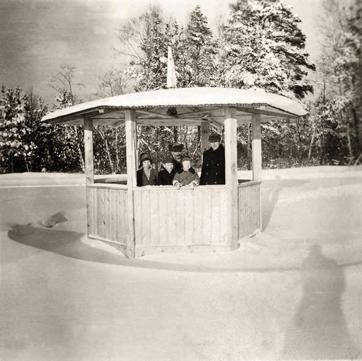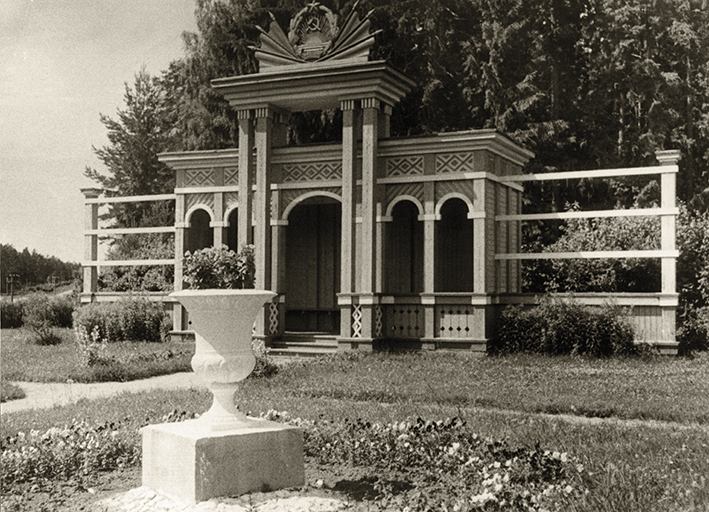 Medinis paviljonas Maltos autobusų stotelėje, 1953 metai. Nuotrauka iš Latvijos kelių muziejaus.