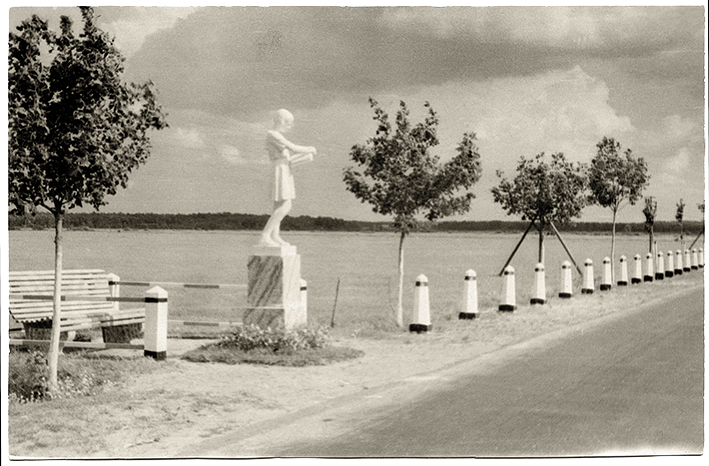 Dekoratyvi skulptūra Pionierius Babytėje prie Rygos–Jūrmalos plento, 1965 metai. Nuotrauka iš Latvijos kelių muziejaus.