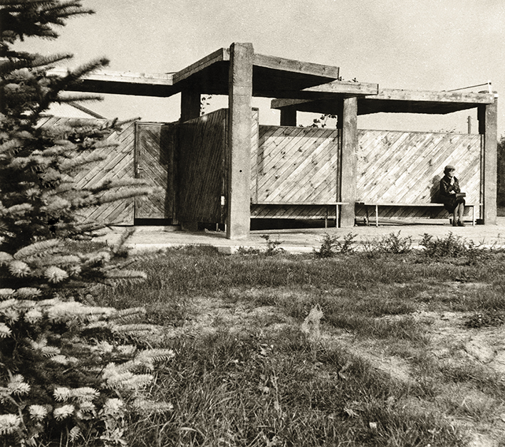 Autopaviljonas autobusų sotelėje prie Raganos–Limbažių autokelio, 20 a. aštuntojo dešimtmečio vasara. Nuotrauka iš Latvijos kelių muziejaus.
