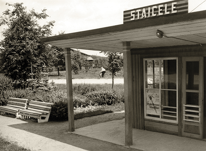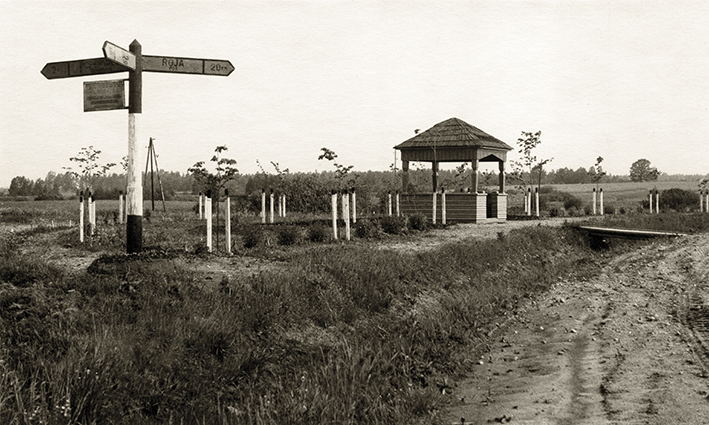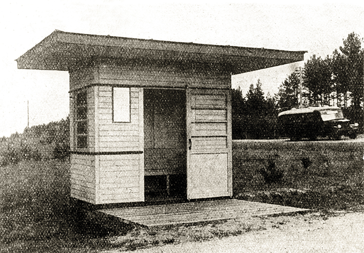 Stotelės paviljonas prie Rygos–Pskovo autokelio (Vidžemės plentas), prie posūkio į Smiltenę, 20 a. šeštasis dešimtmetis. Nuotrauka iš Latvijos kelių muziejaus.