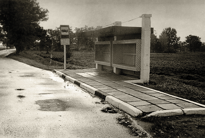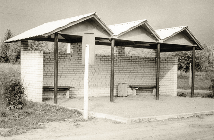 Atviro tipo autopaviljonas autobusų stotelėje. 20 a. aštuntasis dešimtmetis. Nuotrauka iš Latvijos kelių muziejaus.
