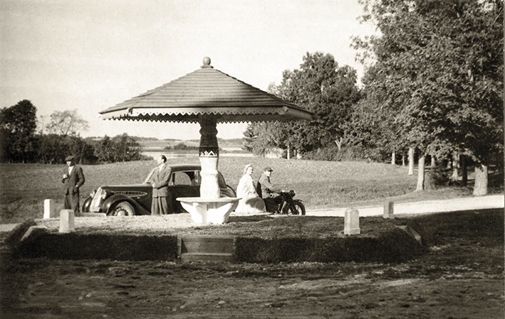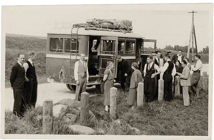Maršrutinio autobuso keleiviai poilsio minutėmis kelyje Ryga–Ragana–Straupė, 1935 metai. Nuotrauka iš Turaidos muziejinio rezervato archyvo.