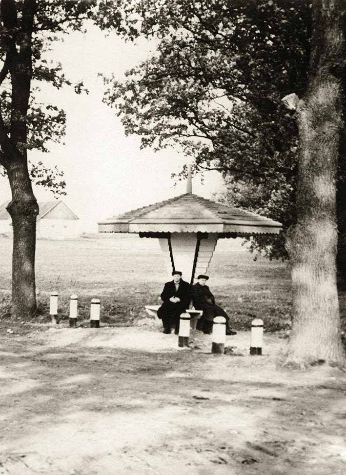 Autobusų stotelė su grybo formos stogine, 1932 metai. Nuotrauka iš Latvijos kelių muziejaus.
