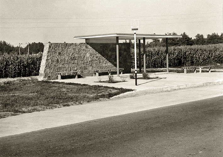 Autopaviljonas autobusų stotelėje posūkis į Taliną Rygos–Pskovo autokelyje, 20 a. septintasis dešimtmetis. Nuotrauka iš Latvijos kelių muziejaus.