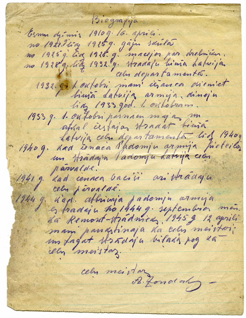 Биография дорожного мастера, 1945 (дата создания документа не указана, но из текста можно предположить, что это 1945 год). Документ из Латвийского музея дорог.